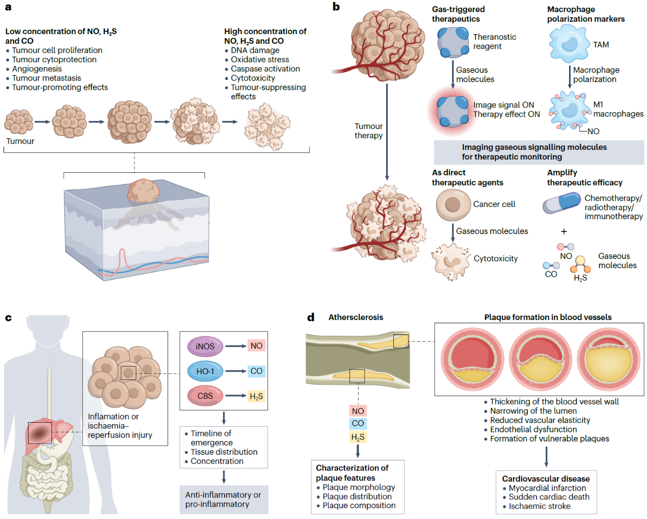 近日,我院陆畅老师以第一作者在Nature子刊 《自然-综述:生物工程》(Nature Reviews Bioengineering)上在线发表了题为“In vivo imaging of gasotransmitters”的综述论文。该论文系统梳理了气体信号分子成像技术的前沿进展,并深入探讨了其在临床诊断与治疗中的巨大潜力与未来方向。我院为本文的合作单位,湖南大学宋国胜教授、张晓兵教授担任通讯作者。