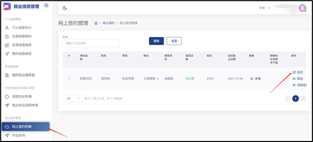 学生可在“网上签约中心-邀约信息中心”查看单位邀约信息,根据自己意愿选择应约单位;邀约信息有效期为14天,过期或选择应约其他企业,邀约信息将失效;毕业生一旦应约成功,代表甲乙双方签约事实形成,不得随意更改信息或解除协议