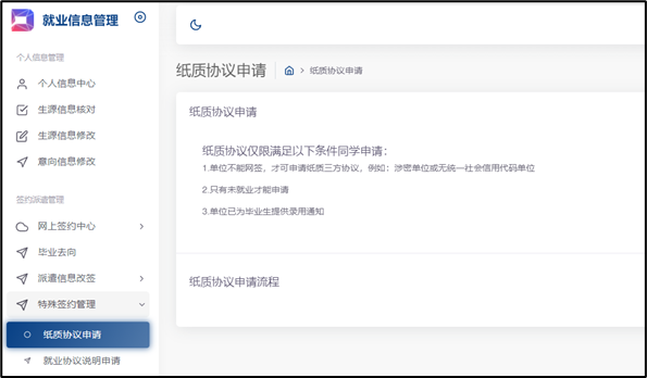 学生点击进入“纸质协议申请”模块,上传录用通知书等证明材料后,提交纸质协议申请,经学校审核通过后,学生再次进入该模块录入单位签约信息,经学校审核通过后,自动生成三方协议,学生再打印三方协议。