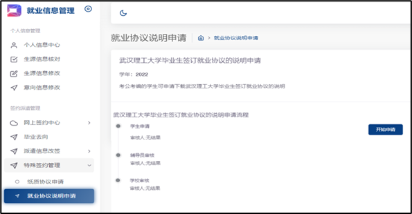 学生应约后,单位需要向学生出示一份盖章的情况说明,写清楚要修改的字段内容。学生在系统中点击进入“电子三方修改”模块,点击“开始申请”,提交盖章的情况说明并在系统中进行修改,经学校审核后完成修改。