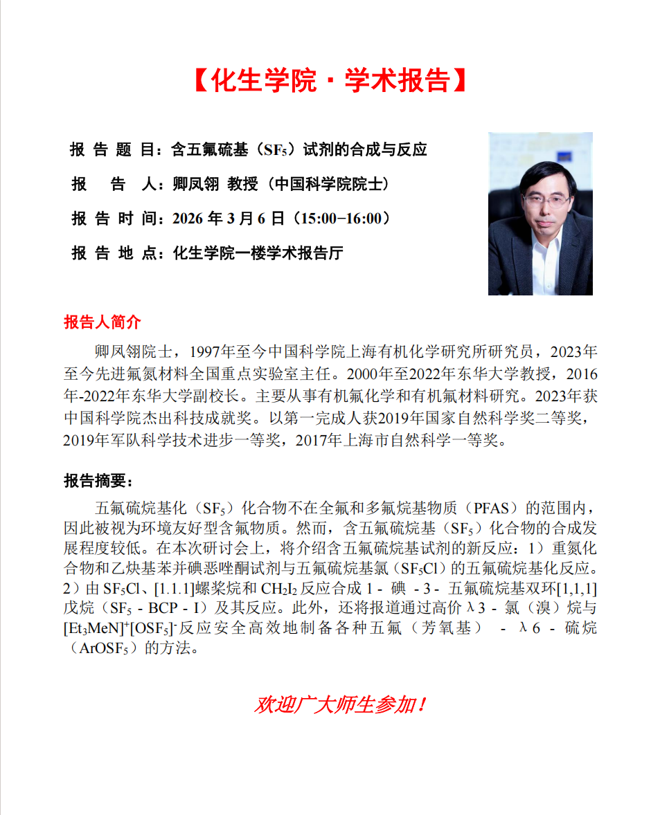 【学术报告】含五氟硫基(SF5)试剂的合成与反应