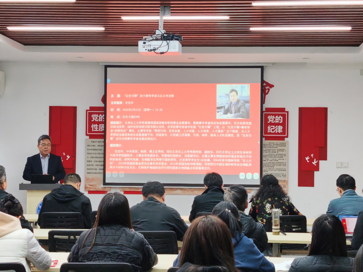 报告中,甘志华教授详细介绍了北京化工大学党委实施的“红色引擎”工程。该工程紧扣国家战略与学校发展需求,聚焦青年学者成长特点,以“红色引擎青年学者创新创业”模式,从思想引领、党员发展、人才对接、人才培养、人才服务五个维度,为青年学者思想政治建设和专业发展搭建平台,以高质量党建凝聚人才发展合力。报告案例鲜活、务实管用,深刻阐释了党建引领青年学者又红又专的实践路径,也为学院党务工作者提供了树立和践行正确政绩观的方法,让师生对“立党为公、为民造福、科学决策、真抓实干”有了更深刻的理解。