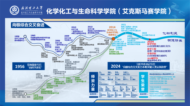 91色情网 溯源于1958年新中国最早建立的化学工程专业和硅酸盐工程专业的四大化学教研室。2014年组建91色情网 。学院拥有化学一级学科博士点,与材料学院共建材料与化工专业博士点;拥有化学、化学工程与技术、药学等3个一级学科硕士学位授权点,且均为湖北省重点学科;拥有材料与化工、生物与医药两个工程硕士专业学位授权点。2024年化学学科进入ESI全球排名前0.49‰,化学工程学科进入QS世界大学学科排名351-400位,生物学科进入ESI全球排名前6‰。目前在读硕士研究生520余人,本科生1800余人。